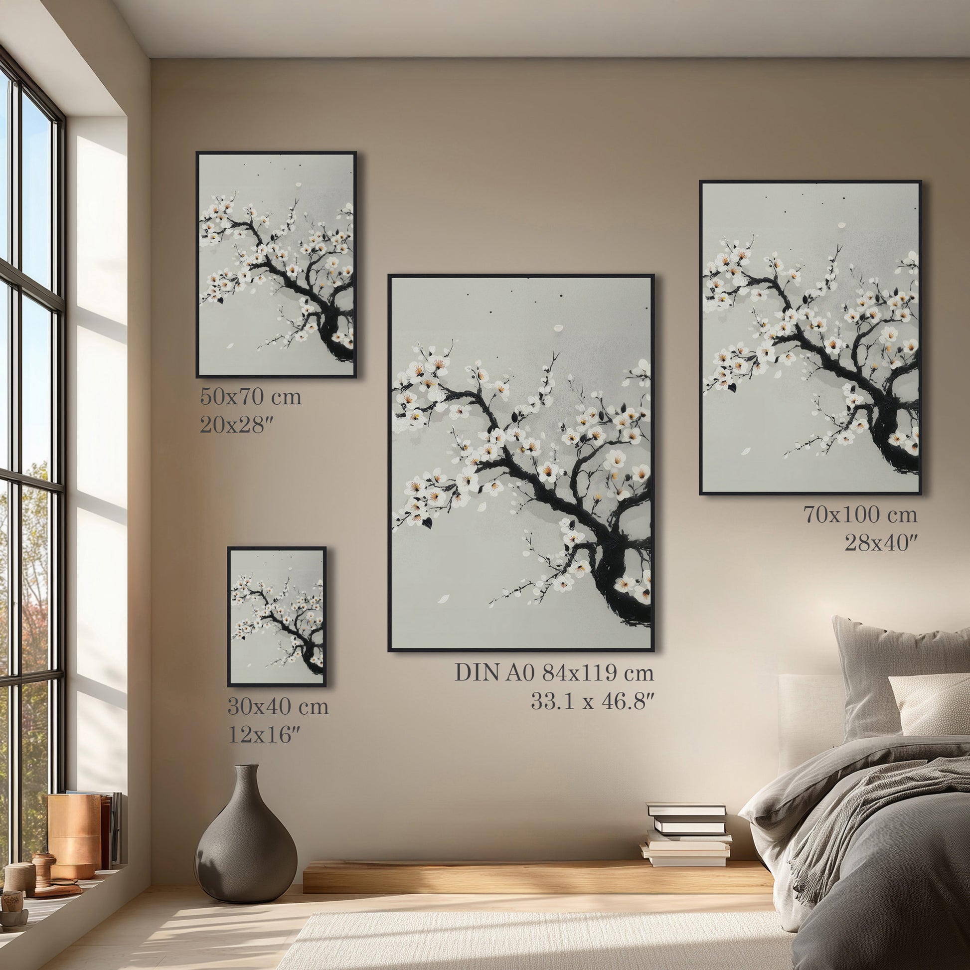 This Japanese blossom art features delicate branches and light blossoms in a minimal, elegant composition. Ideal for bedrooms or Japandi-style interiors, it adds calm and refined botanical beauty.