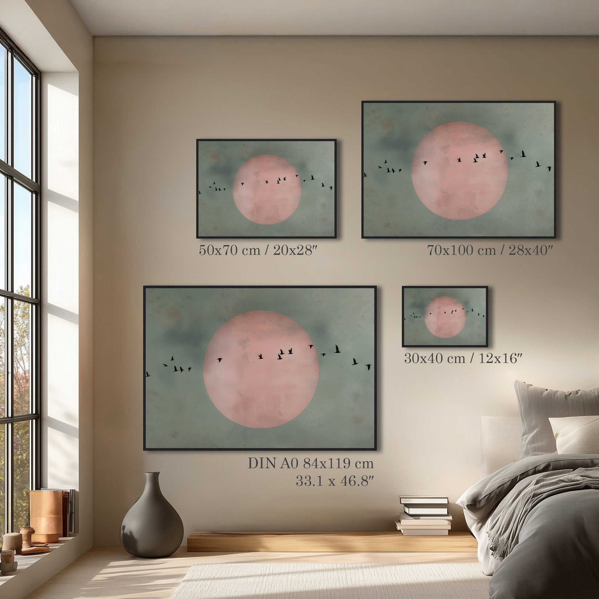 This minimal birds and moon artwork shows birds in flight against a soft moonlit sky, creating a calm and poetic scene. Perfect for modern interiors or bedrooms, it adds balance and quiet elegance to the wall.