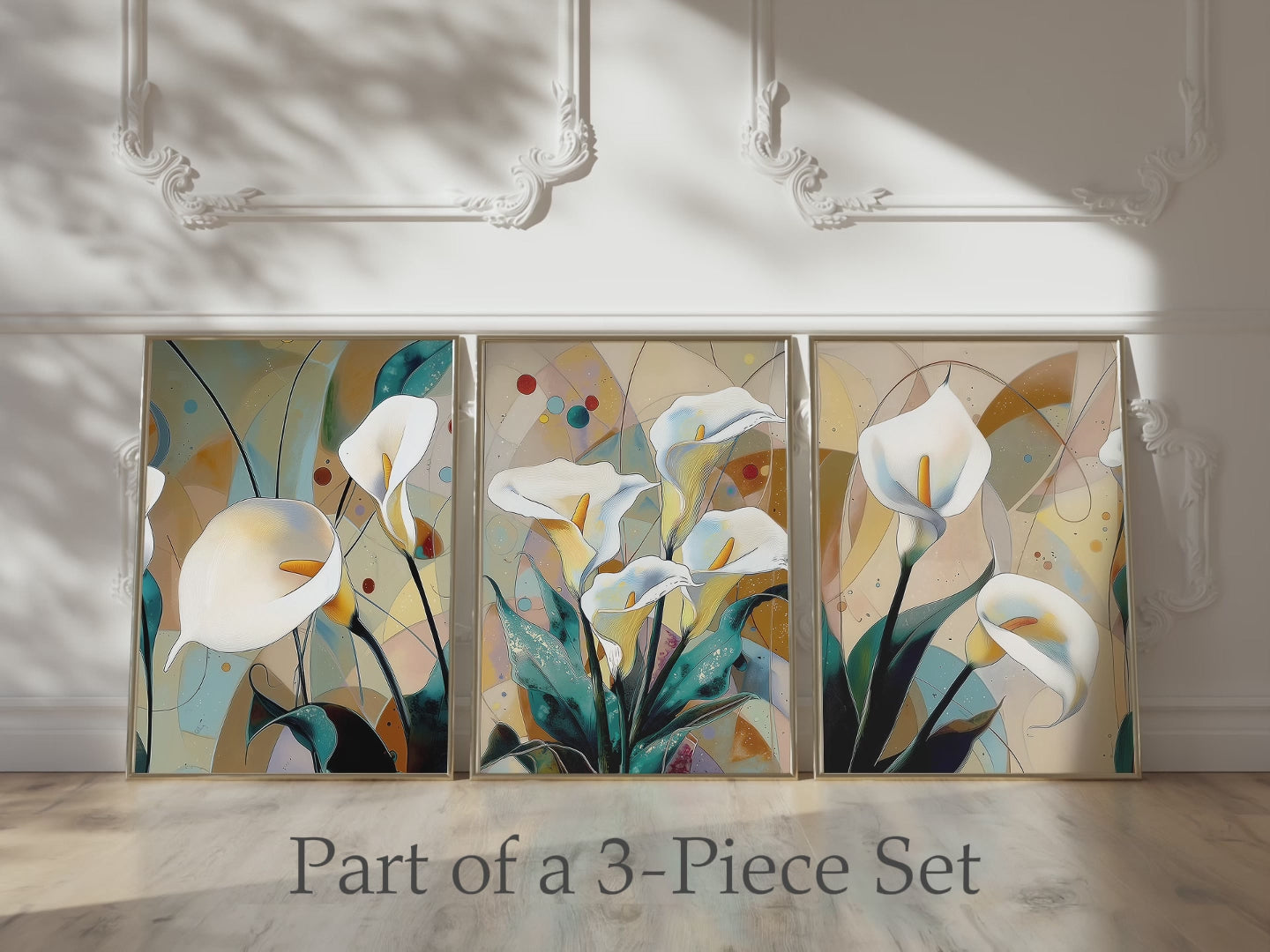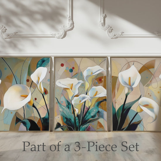 This modern calla lily artwork highlights elegant white flowers in a flowing, contemporary composition. Perfect for living rooms or bedrooms, it adds a refined floral accent with a calm, modern feel.