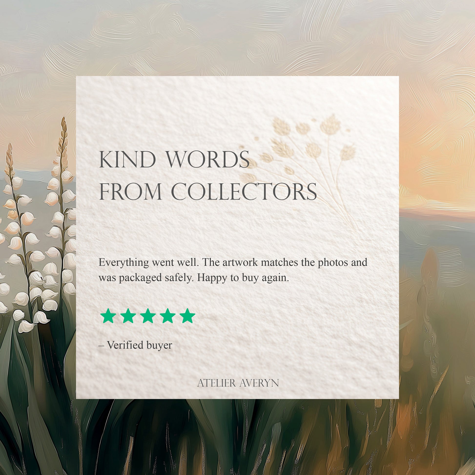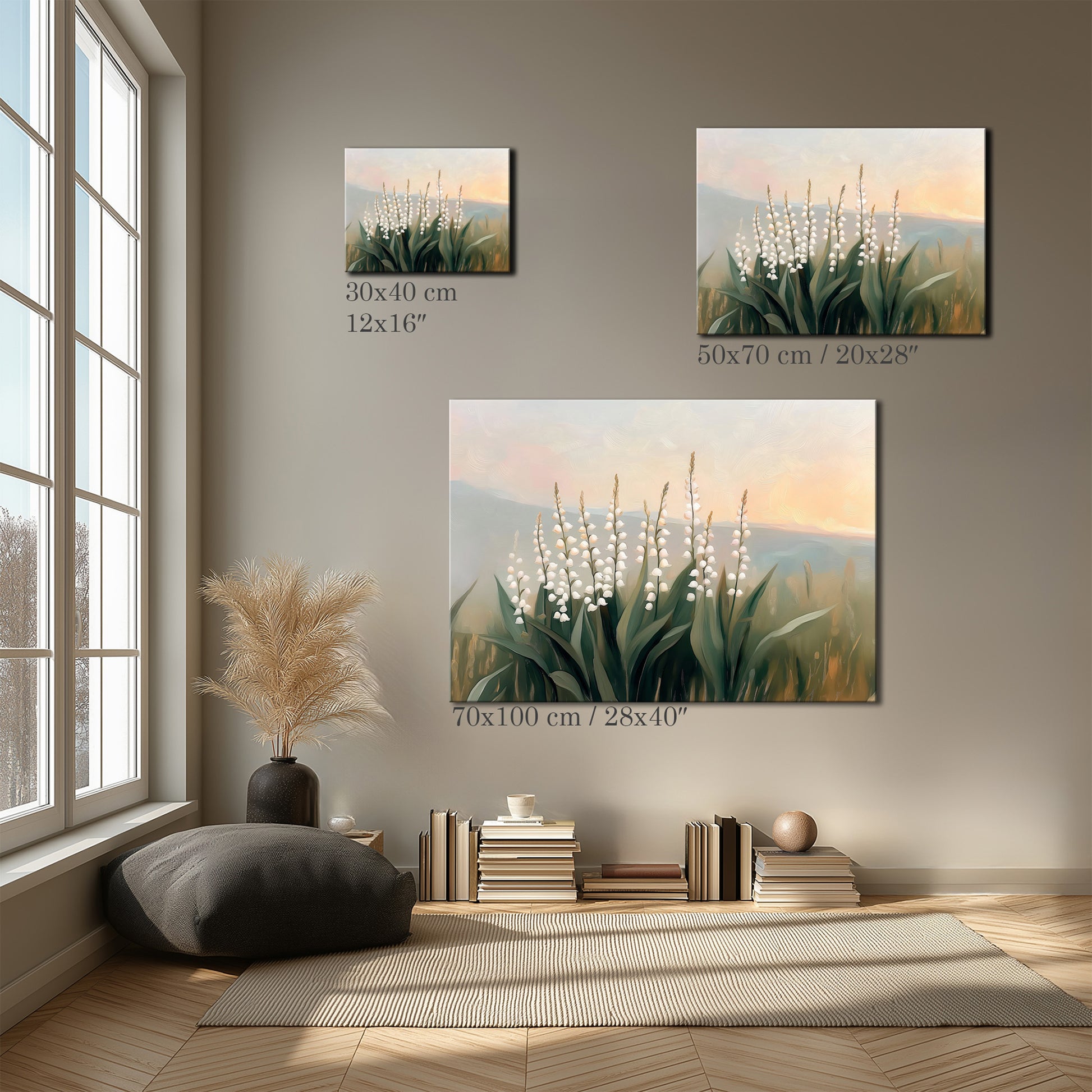 This soft floral landscape artwork shows blooming plants under gentle light, creating a fresh and airy atmosphere. Ideal for living rooms or bright interiors, it brings a peaceful countryside feeling indoors.