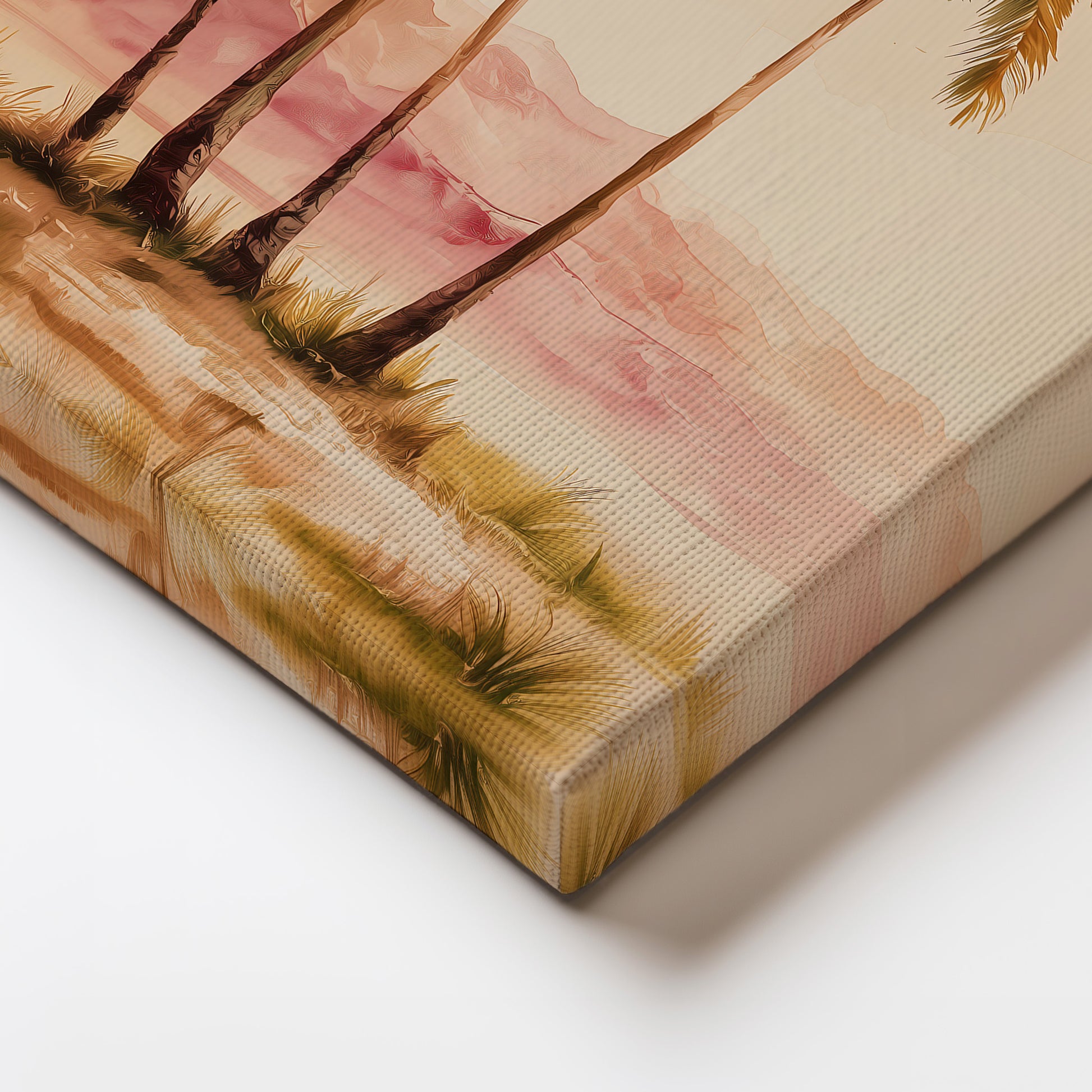 This warm summer tropical artwork features palm trees under soft, sunlit skies. Ideal for living rooms or holiday-inspired interiors, it creates a relaxed and inviting summer atmosphere.