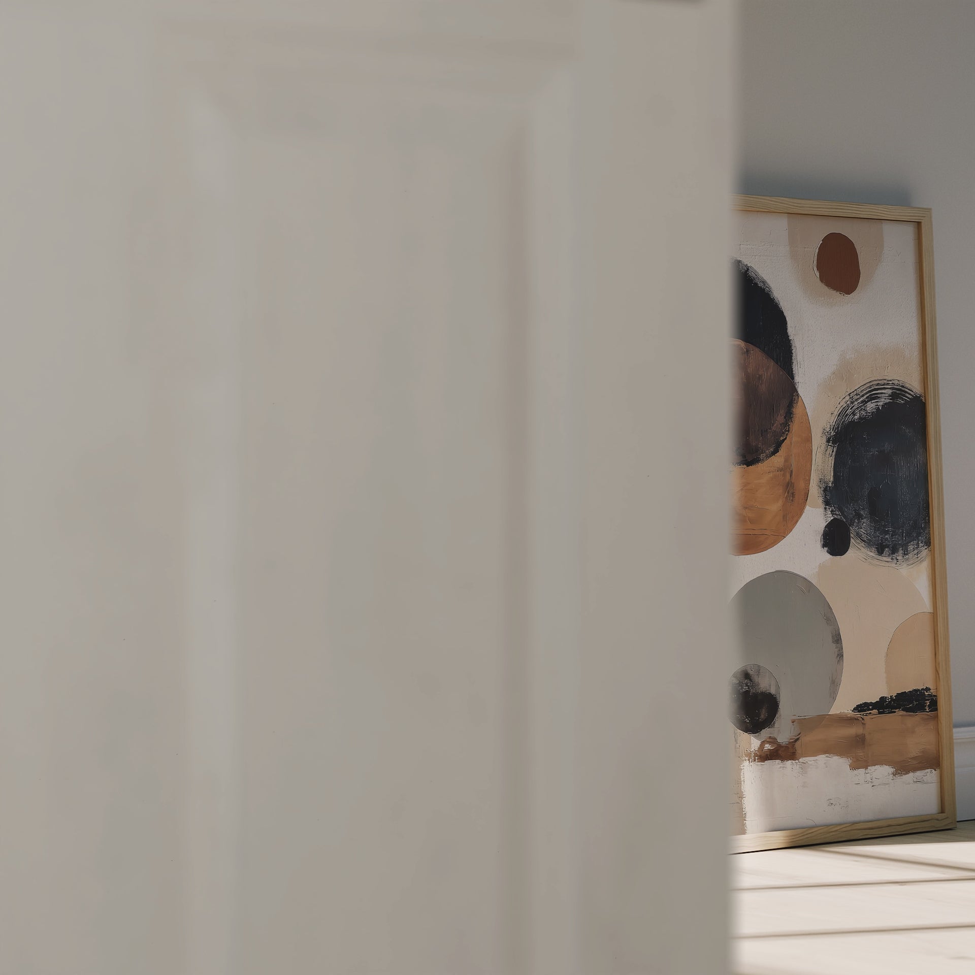 This modern abstract artwork combines soft circular forms with neutral colors for a balanced and harmonious look. Perfect for modern living spaces or creative work environments, it brings subtle movement and elegance to the wall.