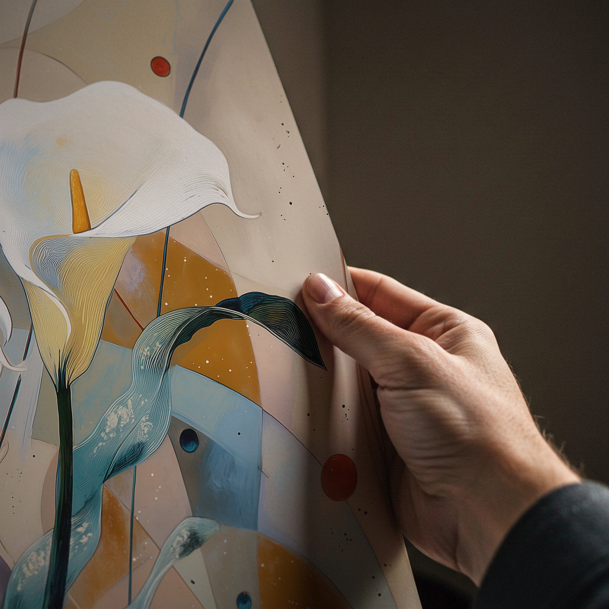 This calla lily wall art features elegant white flowers in a modern, flowing composition. Perfect for living rooms or bedrooms, it adds a refined and calm floral accent to contemporary interiors.
