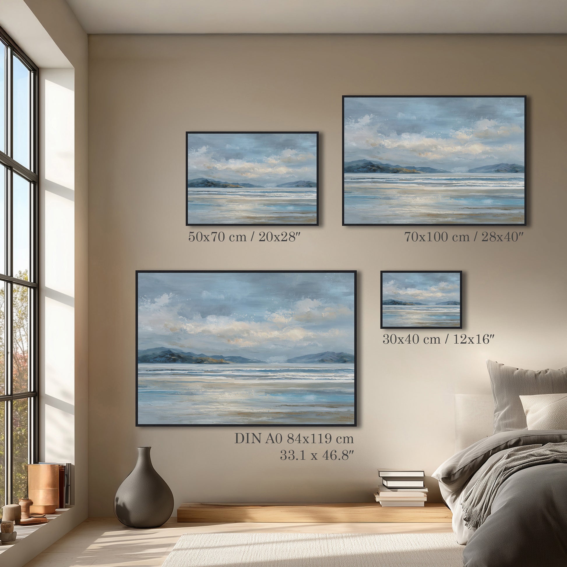 This ocean horizon landscape artwork captures the meeting of sea and sky in gentle, muted colors. Perfect for modern living spaces, it creates a relaxing and open atmosphere inspired by coastal nature.