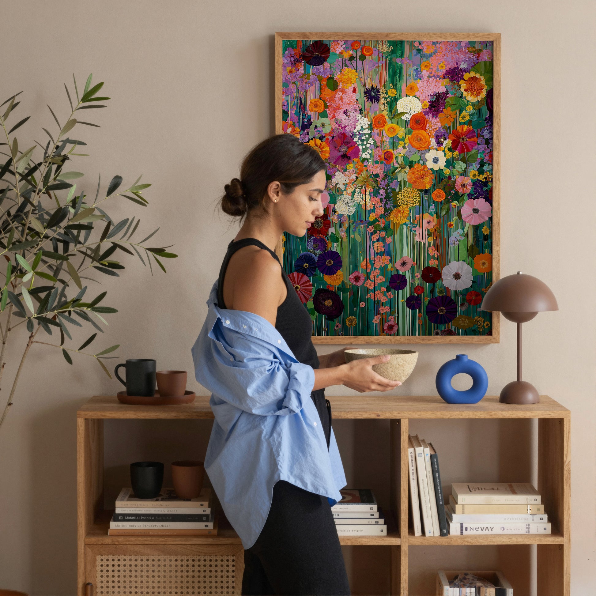 This colorful floral field artwork is filled with vibrant blooms and rich textures that bring energy and joy to the space. Perfect as a statement piece, it adds a lively focal point to modern interiors.