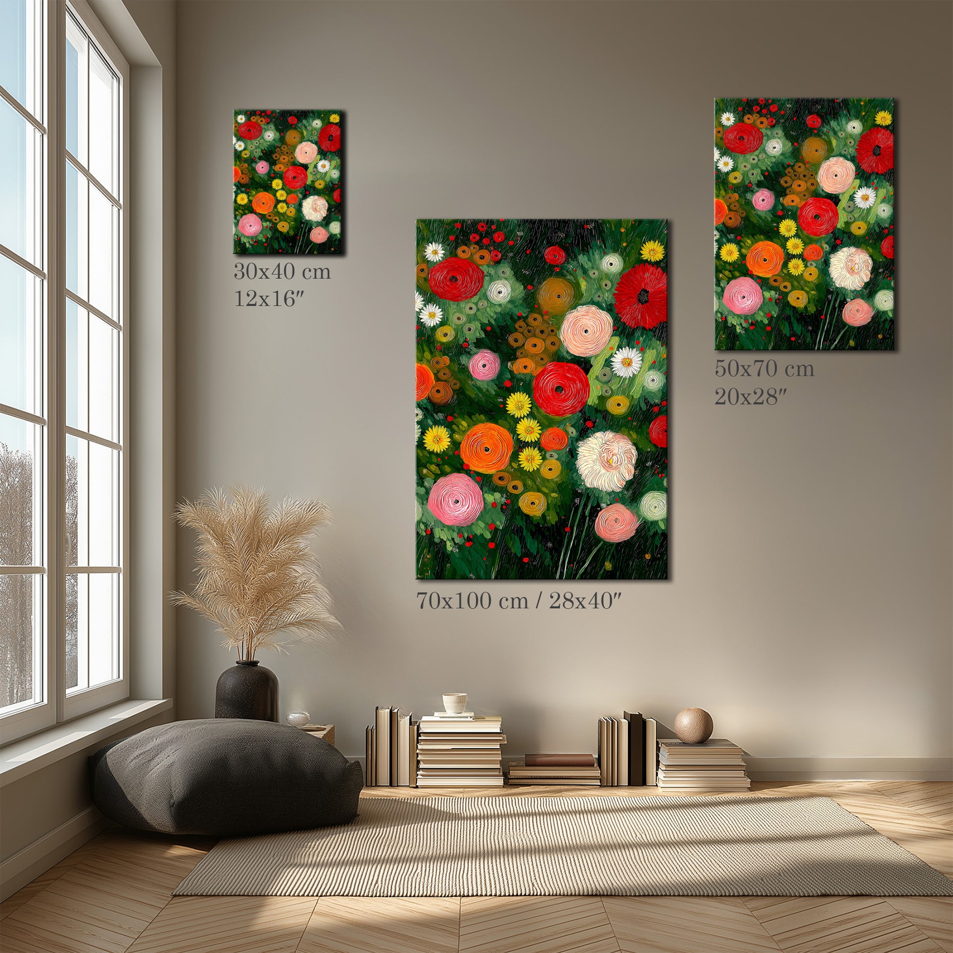 This colorful flower garden artwork shows a variety of blossoms arranged in a lush, natural composition. Perfect for living rooms or dining areas, it adds warmth, color, and a fresh botanical feel to the space.
