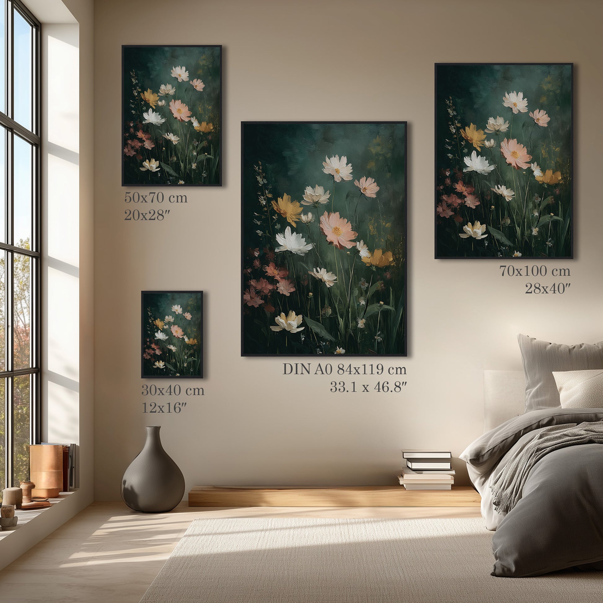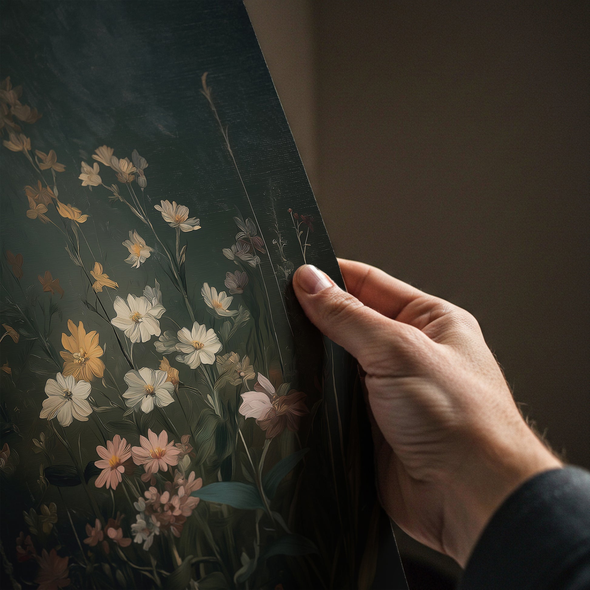 This dark midnight garden oil painting highlights soft flowers emerging from a deep, moody background. Ideal for bedrooms or accent walls, it adds elegance, contrast, and a calm nighttime atmosphere to modern interiors.