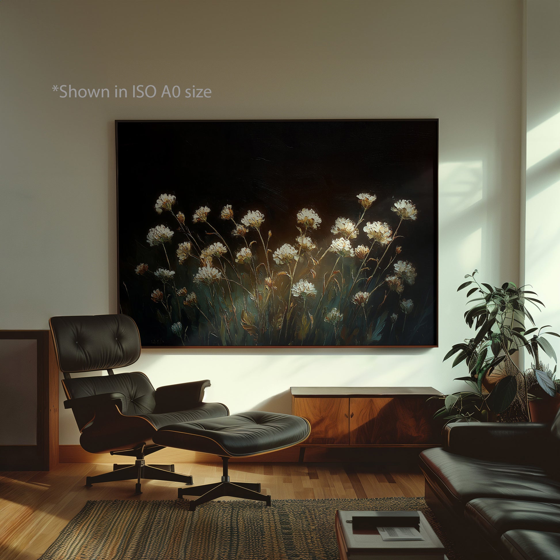 This flowers after dark painting shows glowing blossoms against a deep background, creating strong contrast and atmosphere. Ideal for accent walls or modern interiors, it adds drama while maintaining a calm, elegant mood.