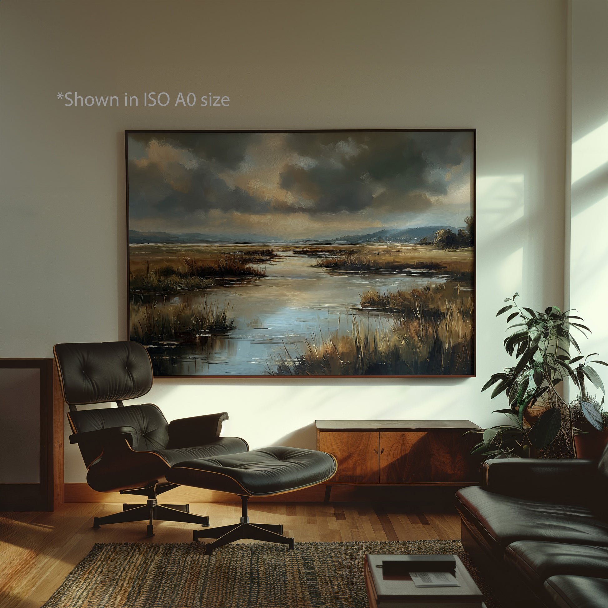 This marshland landscape artwork features open land, water reflections, and soft skies for a quiet, natural mood. Ideal for living rooms or hallways, it adds depth and a sense of wide, peaceful space.