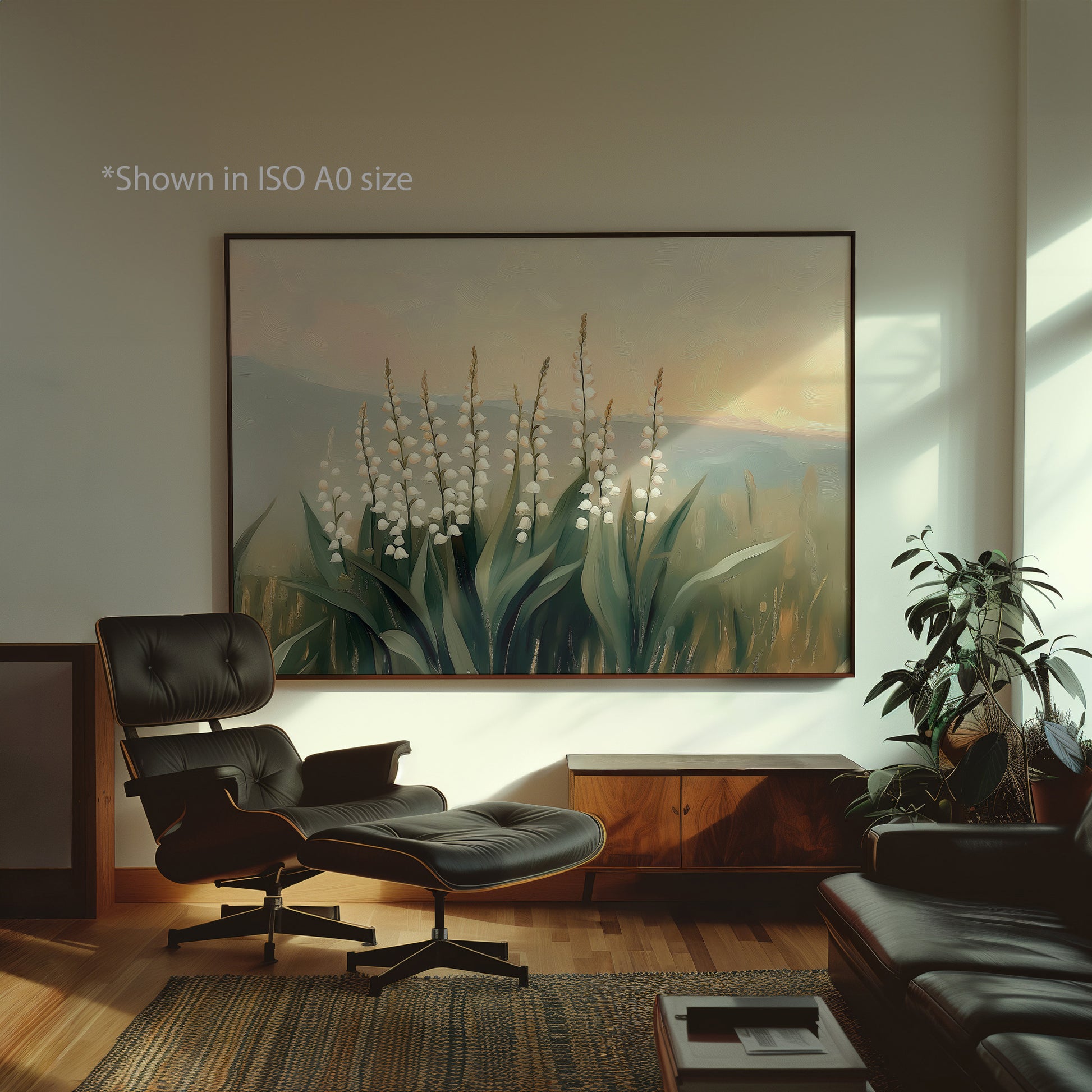 This soft floral landscape artwork shows blooming plants under gentle light, creating a fresh and airy atmosphere. Ideal for living rooms or bright interiors, it brings a peaceful countryside feeling indoors.